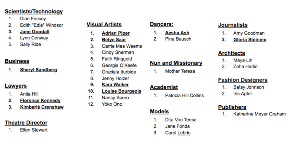 In preparation for our WOI zoom working group event, I organized our list of women. As I added the women suggested by Gabrielle and I’s friends and family, I starred the names that were mentioned more than once. When a name was mentioned more than twice, I double starred it. Then, I highlighted the names that were most popular. It was clear that there was a theme of who is known to be a contemporary influential woman of the past 50 years. So, I created a separate list of 25 women that were likely going to be included in the project based on how often their names were brought up. I also categorized everyone on the list based on their occupation or form of contribution to the world, whether it be visual artist, activist, politician, musician, athlete, etc. Because almost everyone on the list was an activist in some way, I only added them to the activist category if there was no other art form they were known for.